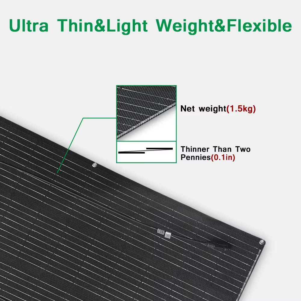 The 100W-400W Monocrystalline Flexible Solar Panel is a versatile and high-efficiency solution for portable and off-grid solar power. Engineered with advanced monocrystalline cells and a durable ETFE surface, this flexible solar panel delivers reliable performance and exceptional energy conversion, making it ideal for RVs, boats, camping, and remote installations.