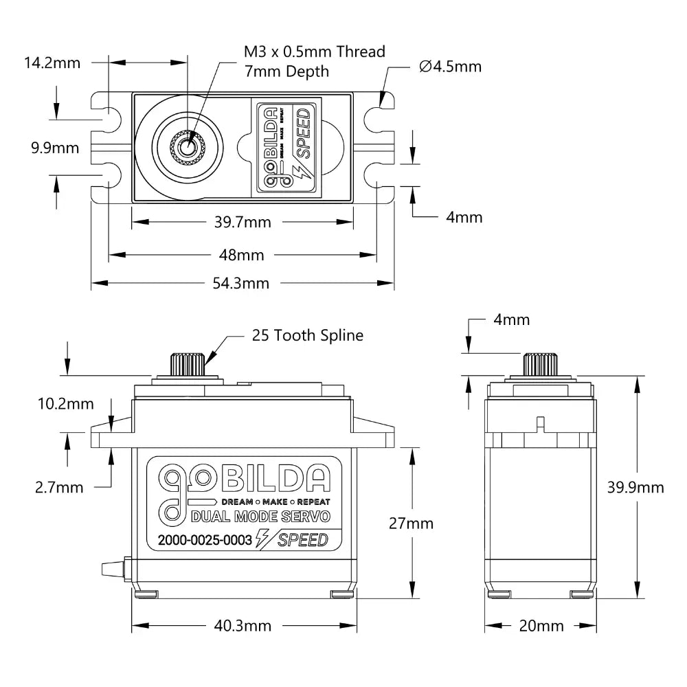 The ServoCity 2000 Series Dual Mode Servo (25-3, Speed) is engineered for rapid transit, offering over twice the speed of its torque-focused predecessor. This servo is designed with dual operational modes to enhance versatility. In Default Mode, it provides rotational movement with positioning feedback, controlled by a PWM signal to determine its position. Alternatively, it can be switched to Continuous Rotation Mode using a compatible programmer, allowing for proportional speed control based on the PWM signal. This adaptability makes it suitable for various applications requiring precise and swift movements.