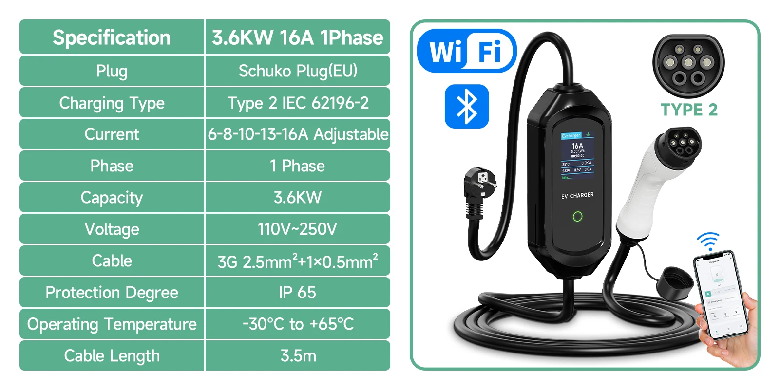 The 3.6kW Portable EV Charger is a smart, versatile charging solution designed for electric vehicle owners who demand flexibility, safety, and control. Compatible with Type 2 (IEC62196-2), Type 1 (SAE J1772), and GBT connectors, this 3.6kW Portable EV Charger works with all major EV brands and is certified to global safety standards (CE, UL, RoHS).