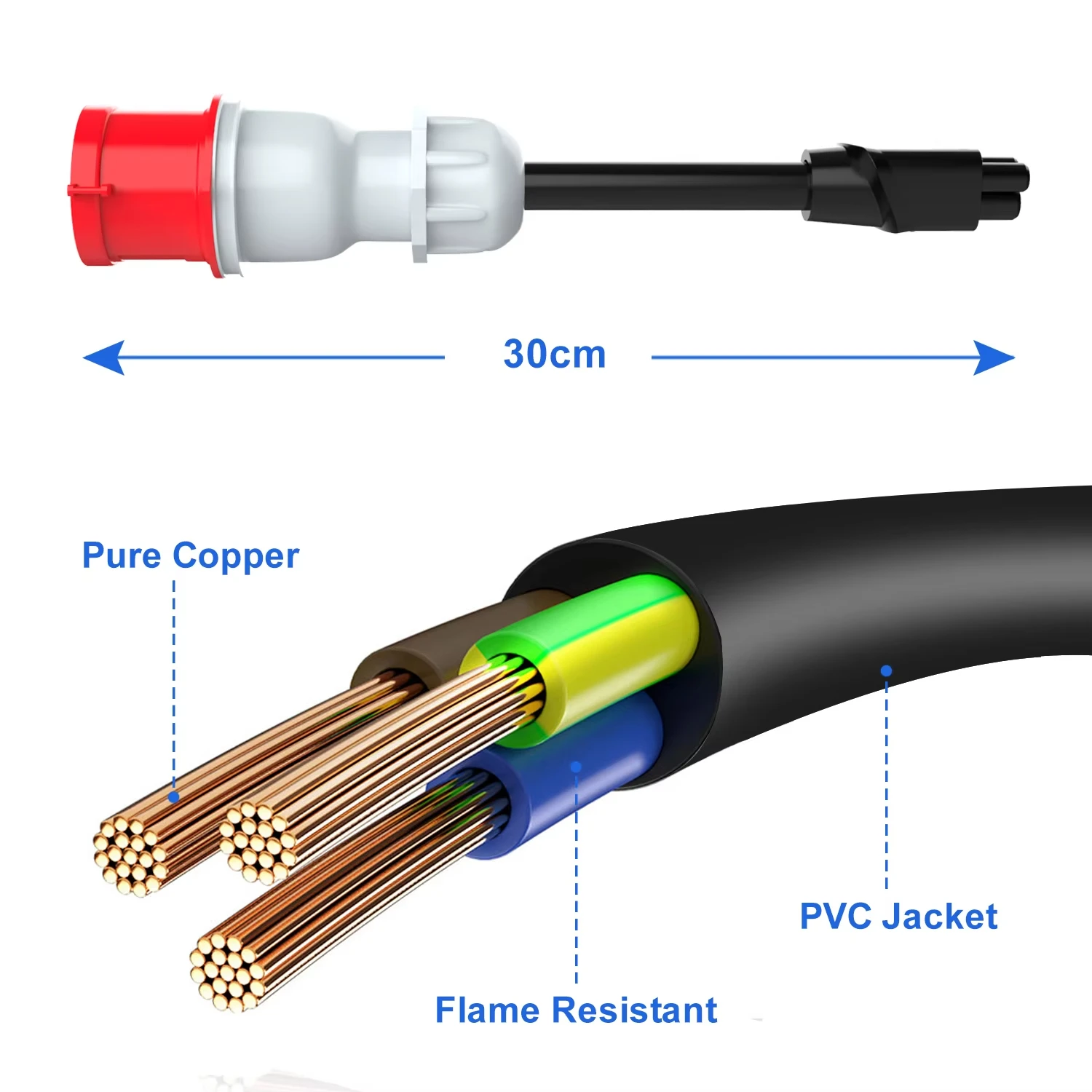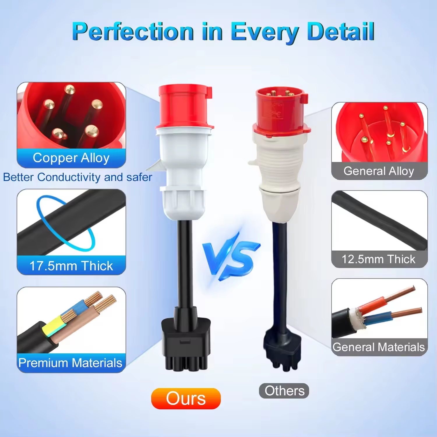 Constructed with premium copper alloy contacts, the adapter offers superior conductivity and enhanced safety compared to standard general alloy alternatives. The cable features a robust 17.5mm thickness, significantly thicker than typical adapters, ensuring durability and efficient power transfer. The use of pure copper wires and a flame-resistant PVC jacket further enhances the adapter’s reliability, making it suitable for both home and commercial charging environments.