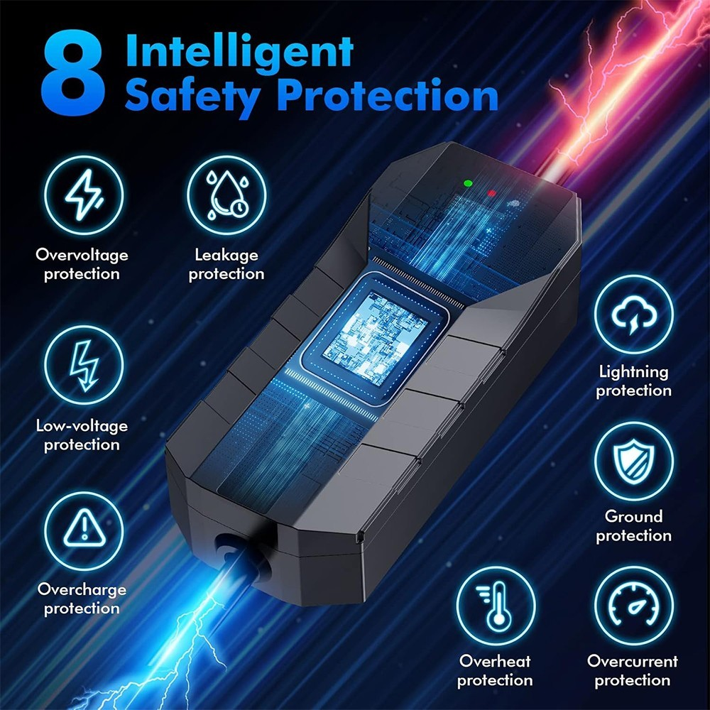 Engineered for universal compatibility, the 32Amp Level 2 EV Charger utilizes the SAE-J1772 standard plug, making it suitable for nearly all EV models on the market. The heavy-duty 23-foot cable provides flexibility for indoor or outdoor use, while the adjustable amperage (10A/16A/24A/32A) allows you to tailor charging speed to your needs and circuit capacity.