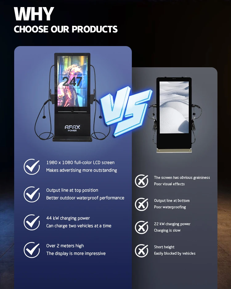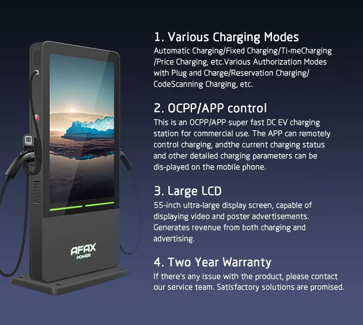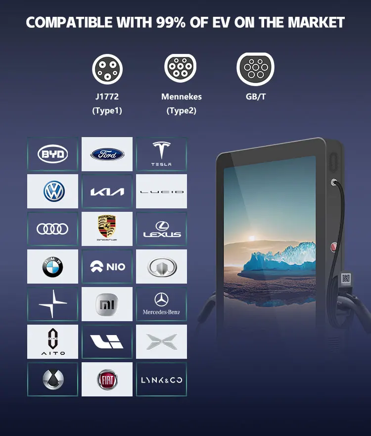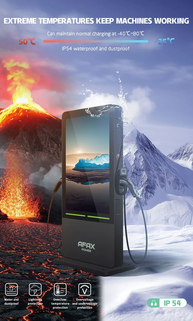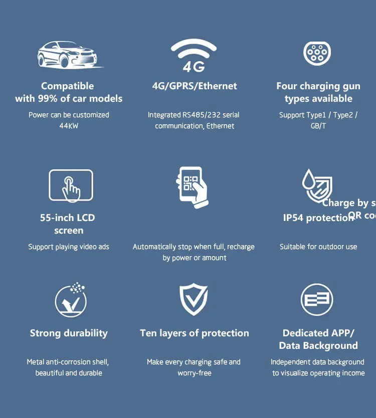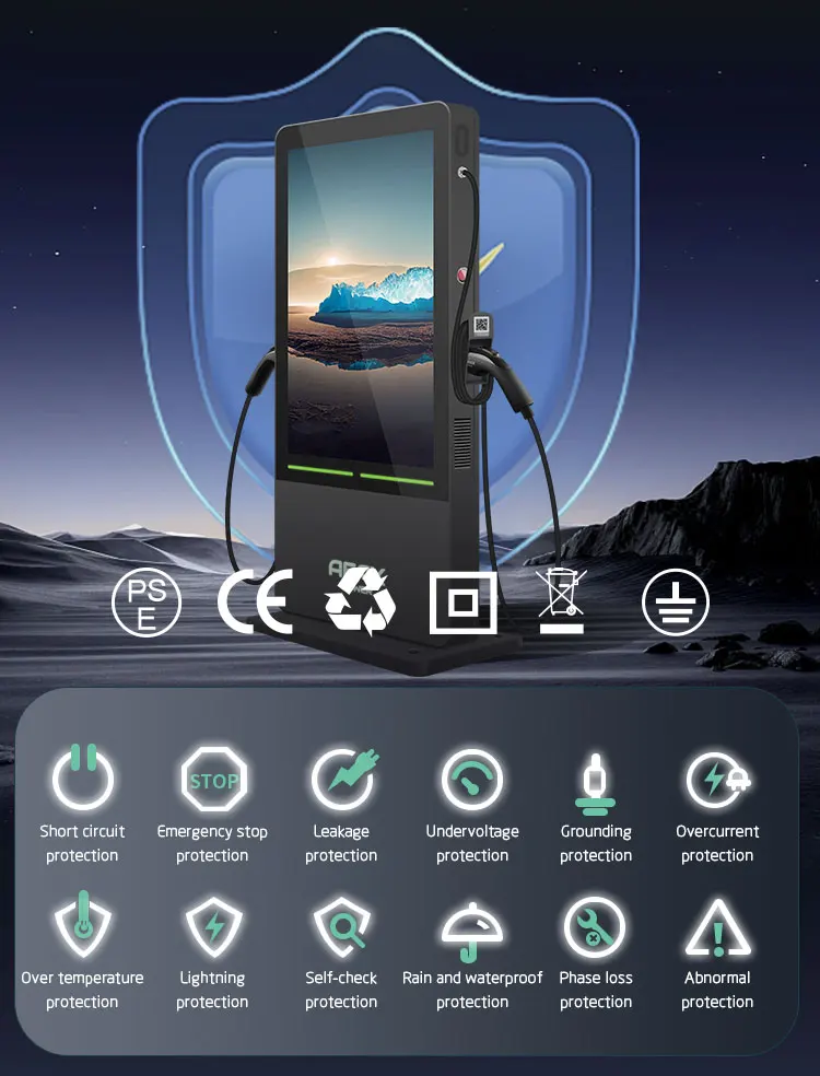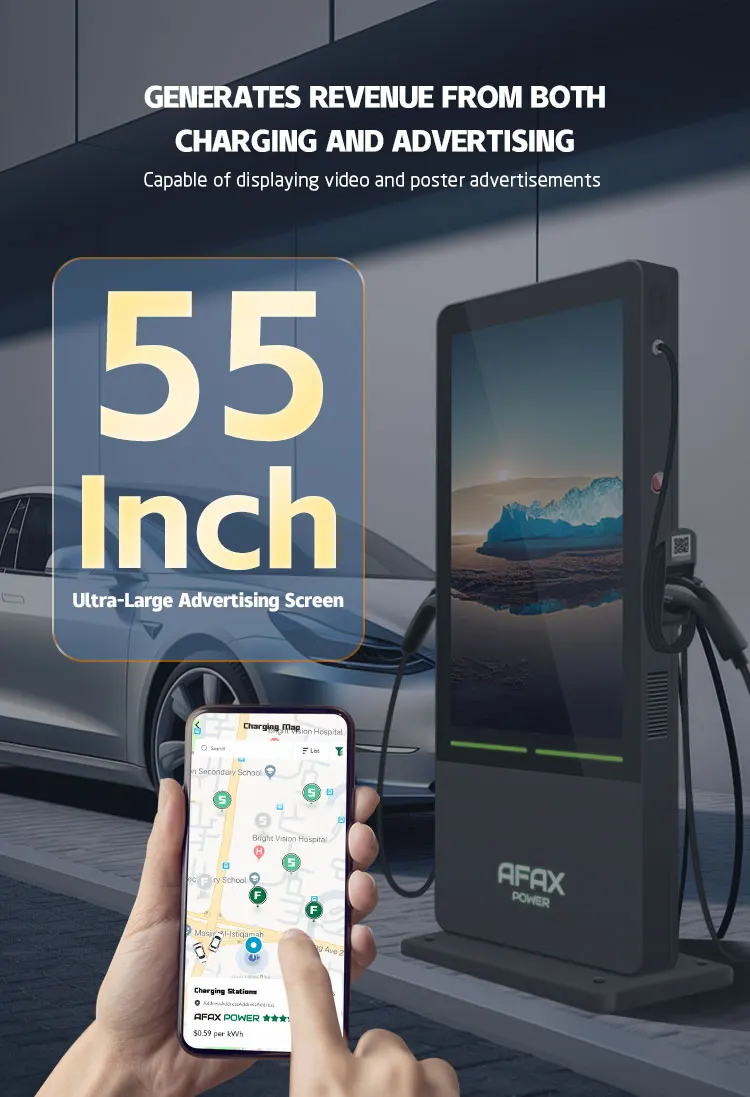 The 44kW AC Charging Station with 55″ Advertising Screen is a next-generation solution that seamlessly combines high-speed electric vehicle charging with dynamic digital advertising. Designed for high-traffic locations such as hotels, airports, shopping malls, and highways, this innovative charging station delivers up to 44kW (2 x 22kW) of AC fast charging power, supporting both Type 2 (IEC 62196-2) and GB/T 20234.2 connectors for maximum compatibility with a wide range of electric vehicles.