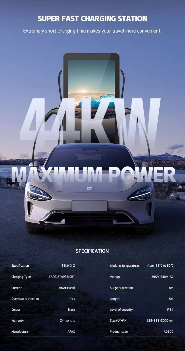 44kW AC Charging Station with 55″ HD advertising screen, dual 22kW outputs, Type 2 and GB/T compatibility, advanced safety features, and triple network connectivity for public and commercial EV charging.