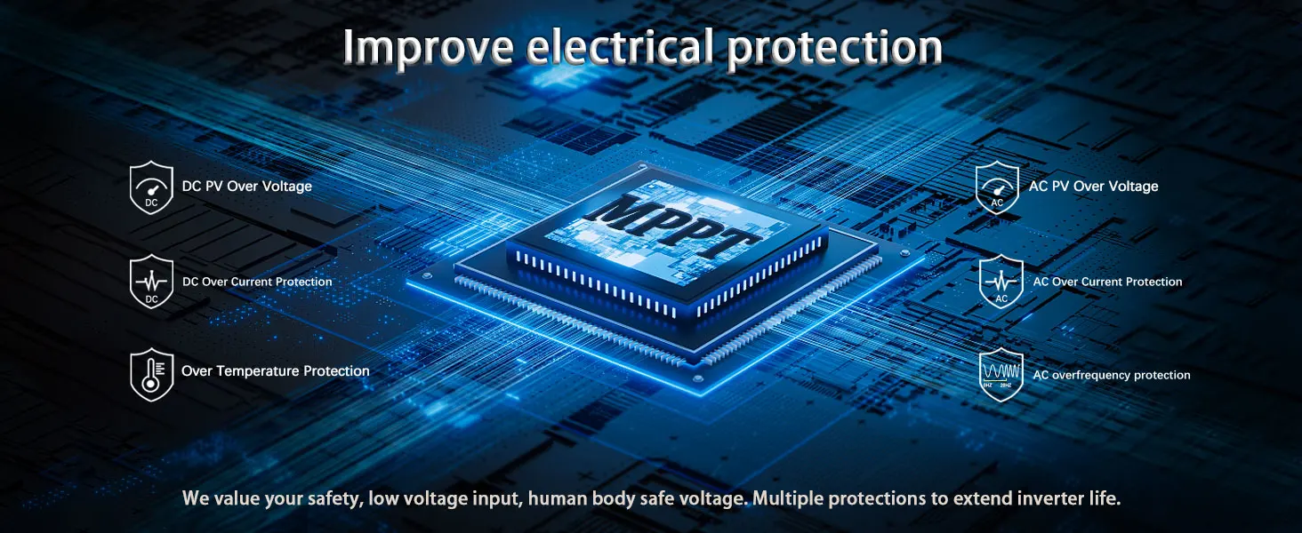 Powered by a high-speed, high-specification MCU, the inverter delivers reliable, efficient operation and supports both 12V and 24V battery systems. The pure sine wave output ensures compatibility with sensitive electronics and household appliances, while the high-frequency transformer and advanced anti-islanding technology provide robust safety and system protection.