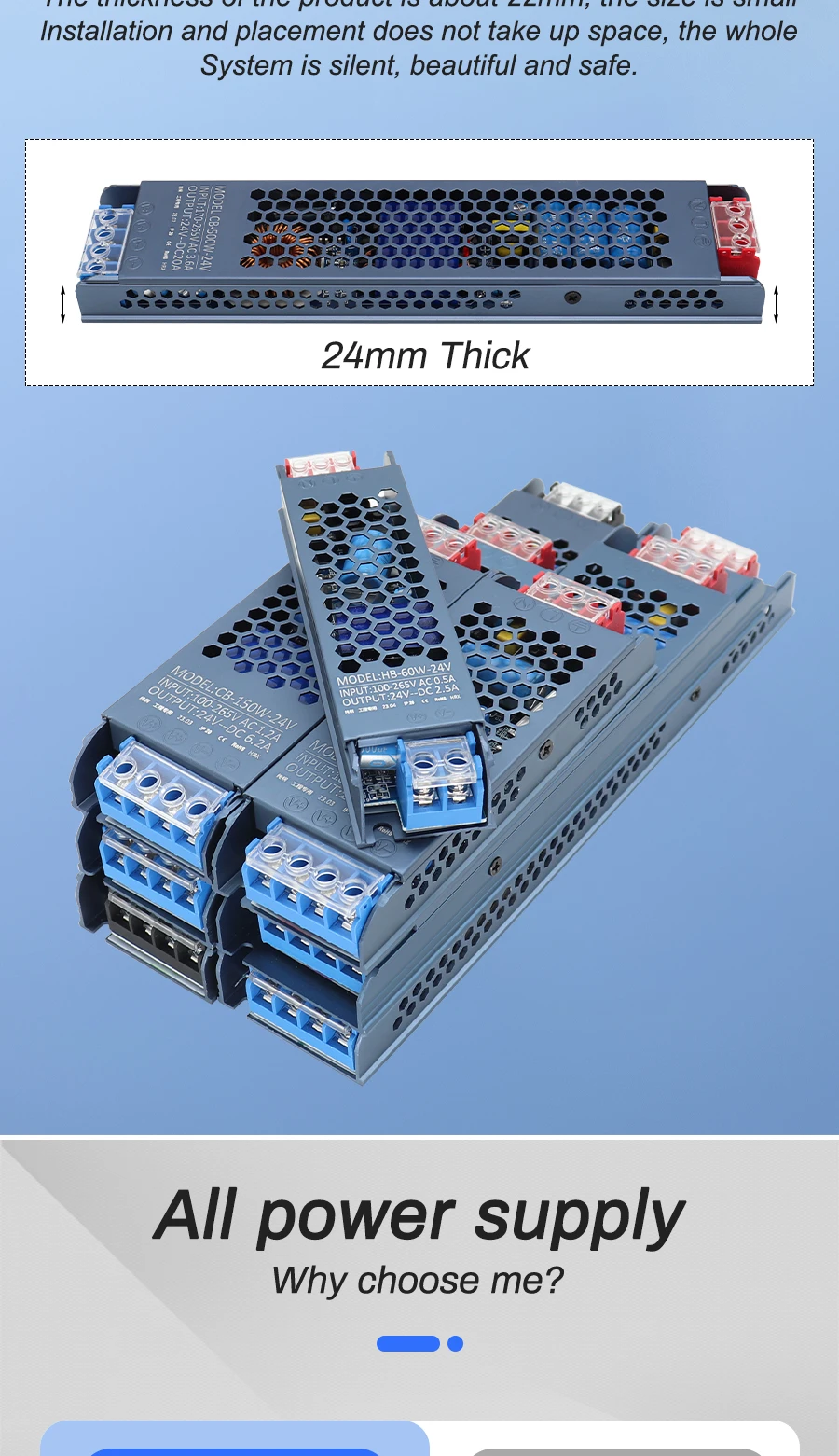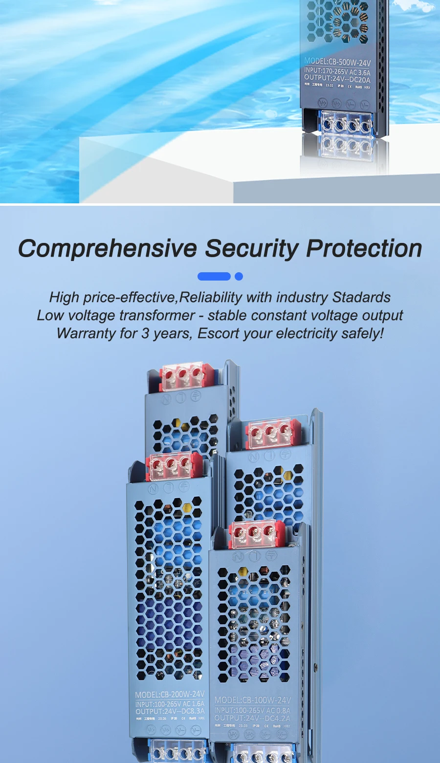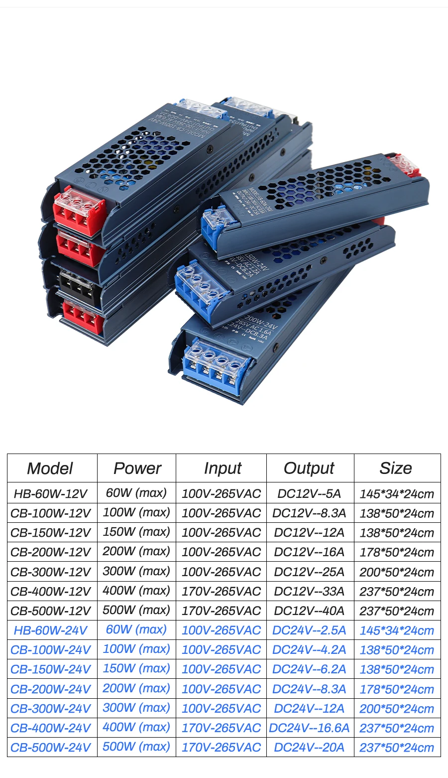 The 60W–500W 12V–24V AC-DC Power Supply is a high-quality, ultra-thin LED driver and transformer designed for reliable, efficient power delivery in lighting applications. With a wide input voltage range of AC 110V–250V (60–300W models) and 170V–250V (400–500W models), this power supply delivers a stable DC output of either 12V or 24V (±3% tolerance), making it ideal for LED strips, light boxes, billboards, shop signs, home decor, and other LED lighting systems.