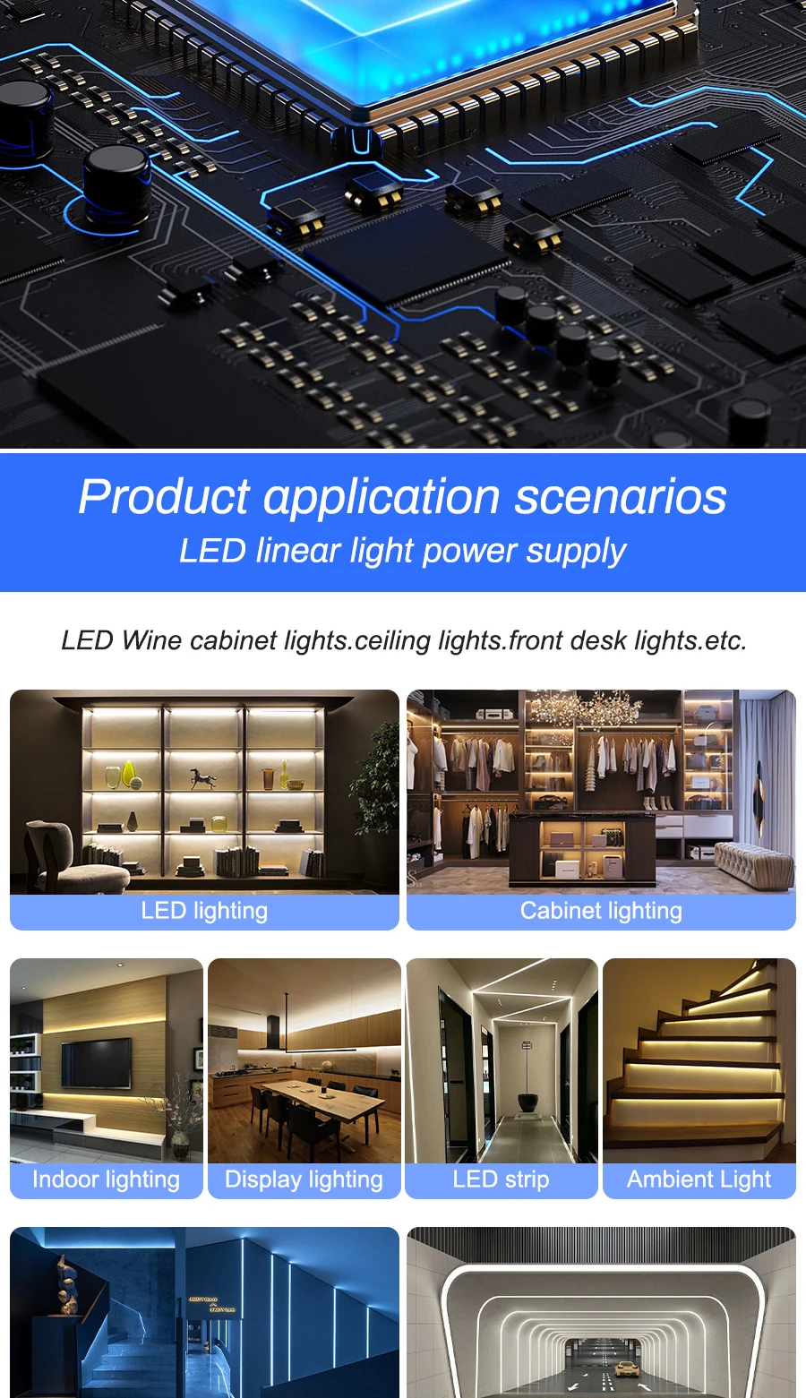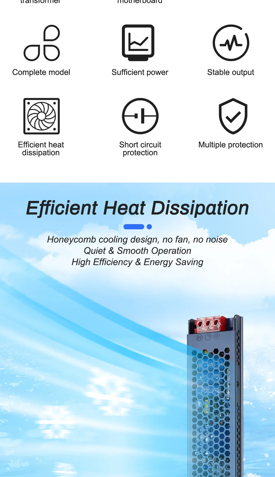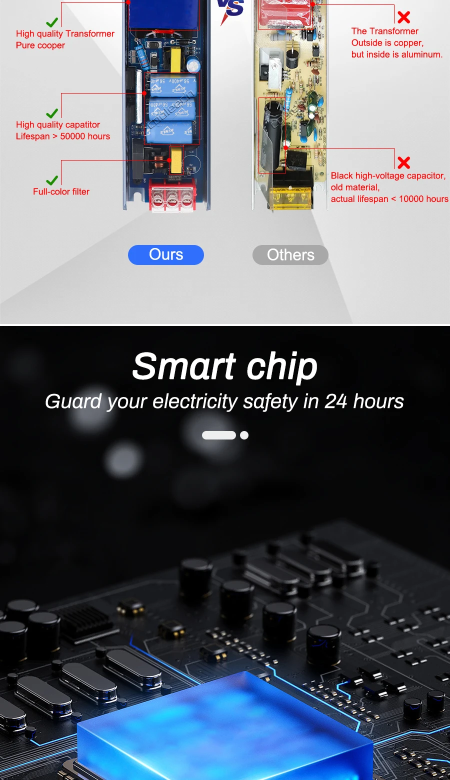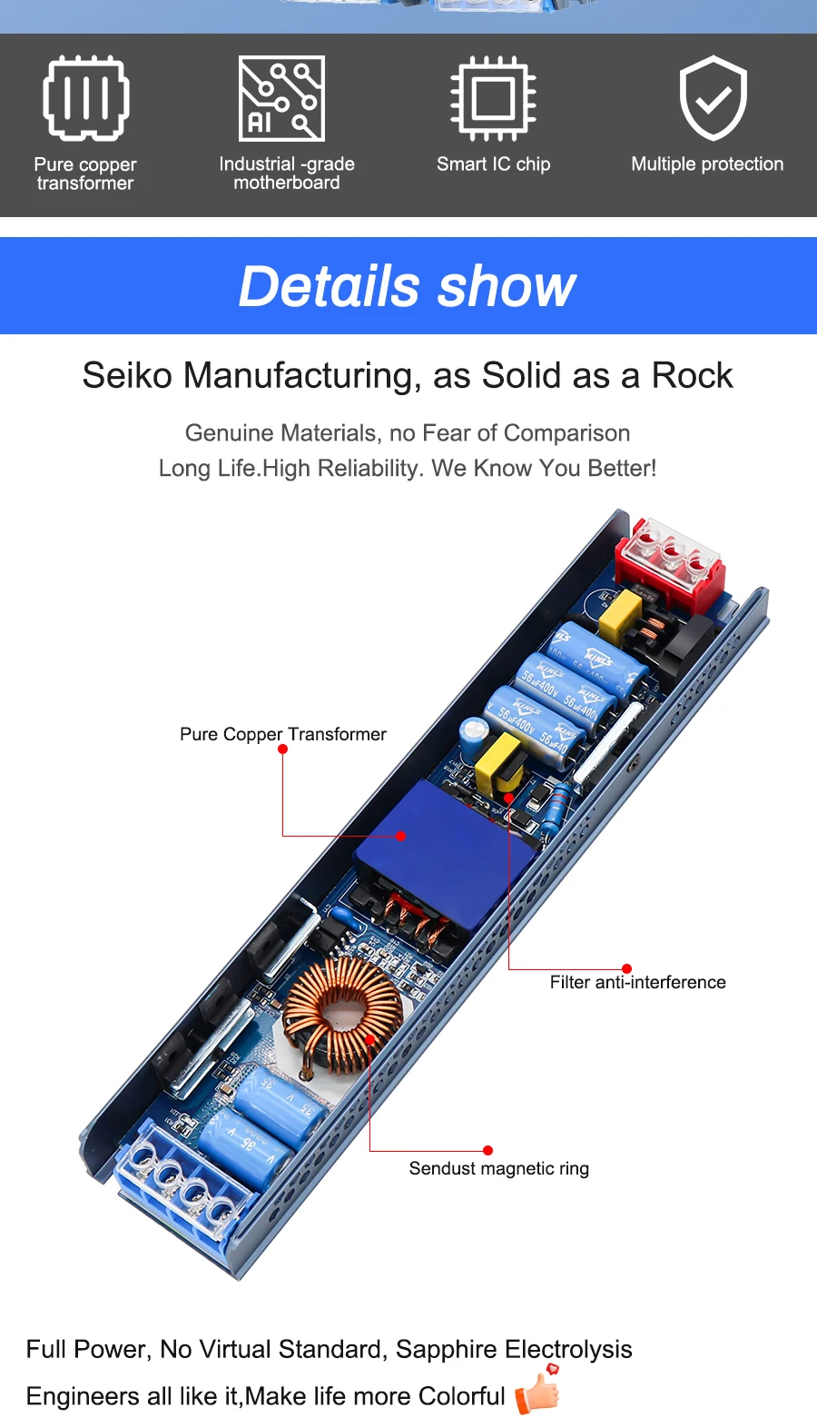 Engineered with a high-conductivity aluminum case, this power supply offers excellent heat dissipation and silent operation, ensuring long-term durability and safety. The compact, super-thin design allows for easy installation in tight spaces, while the robust build meets FCC, CE, and RoHS safety standards. The unit operates efficiently in environments with temperatures from °C to 60°C and humidity up to 95% non-condensing, making it suitable for a wide range of indoor lighting projects.