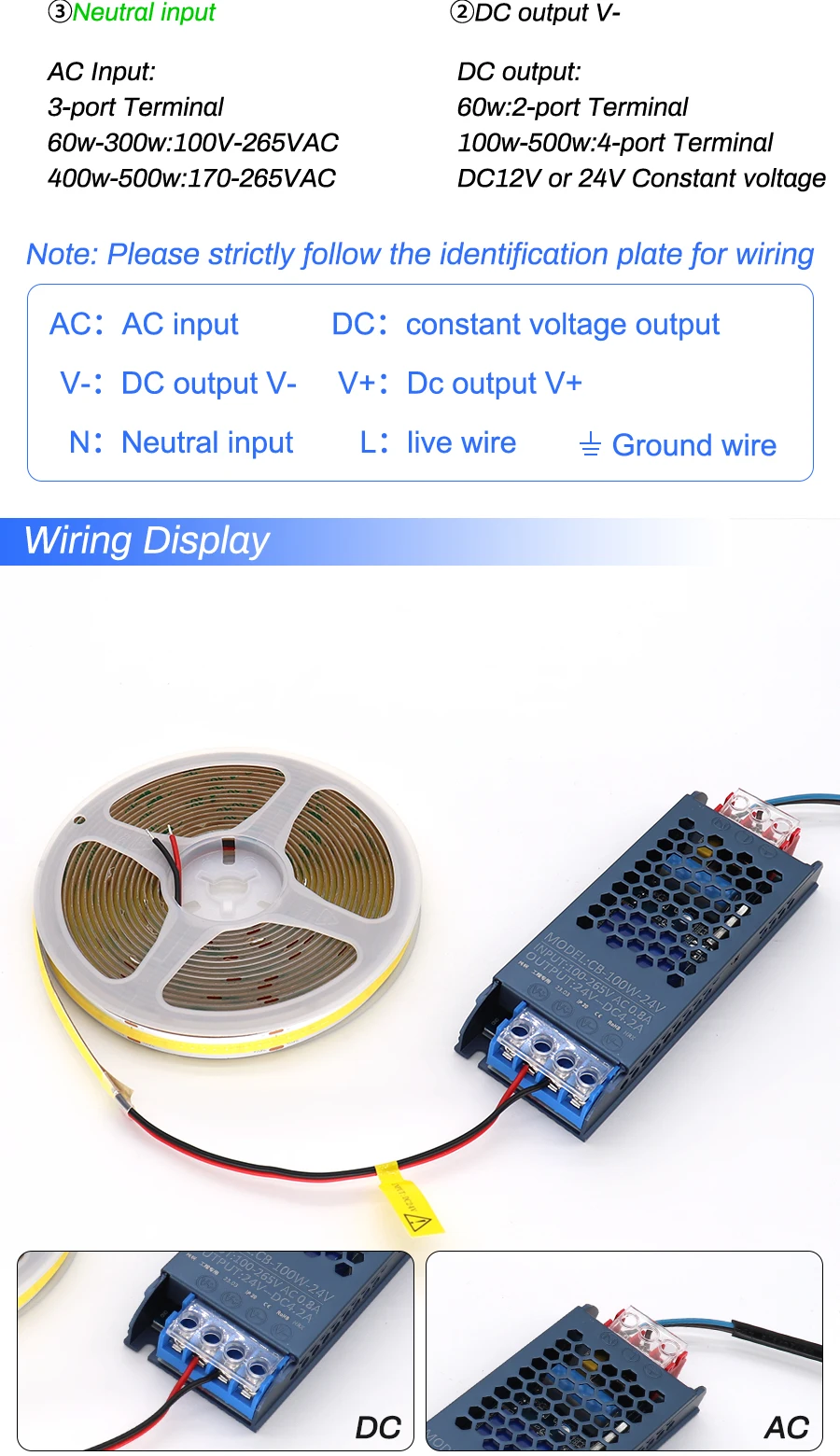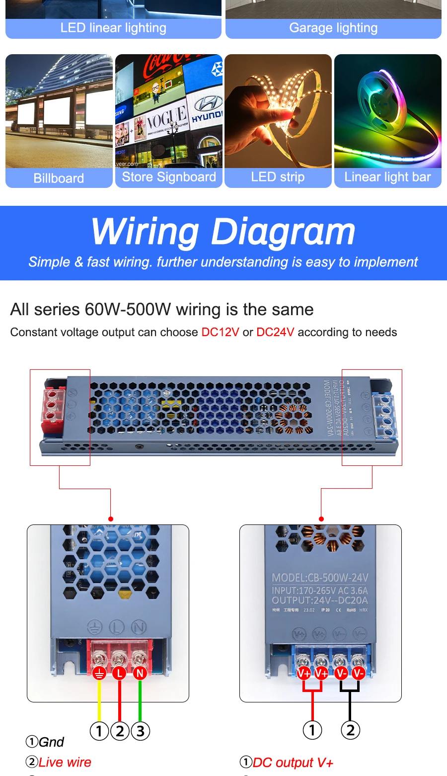 Available in power ratings from 60W to 500W, the power supply features multiple output options to match your specific needs. Each model is equipped with clear wiring terminals for AC input and DC output, supporting both 12V and 24V constant voltage operation. Please note that this power supply is specifically designed for LED lighting and is not recommended for use with machinery, automation equipment, or small household appliances.