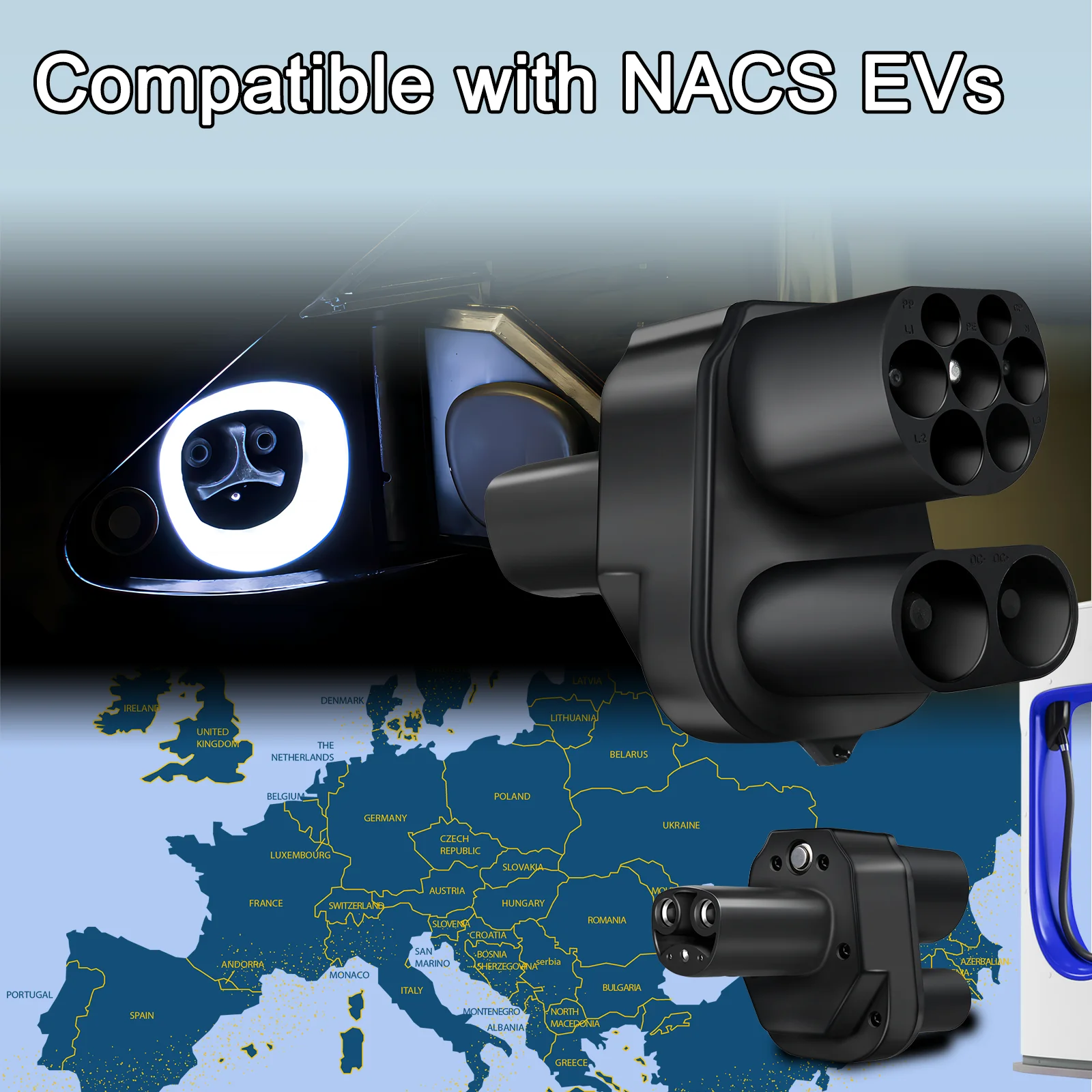The CCS2 to NACS Adapter is engineered for seamless compatibility with Tesla Model S, 3, X, and Y, enabling effortless charging from CCS2 and Type 2 charging stations. Designed for high-performance electric vehicle charging, this adapter supports up to 300A of current, making it ideal for rapid charging scenarios. Constructed from premium PA66 fireproof materials, the adapter ensures maximum safety and durability, even under demanding conditions.