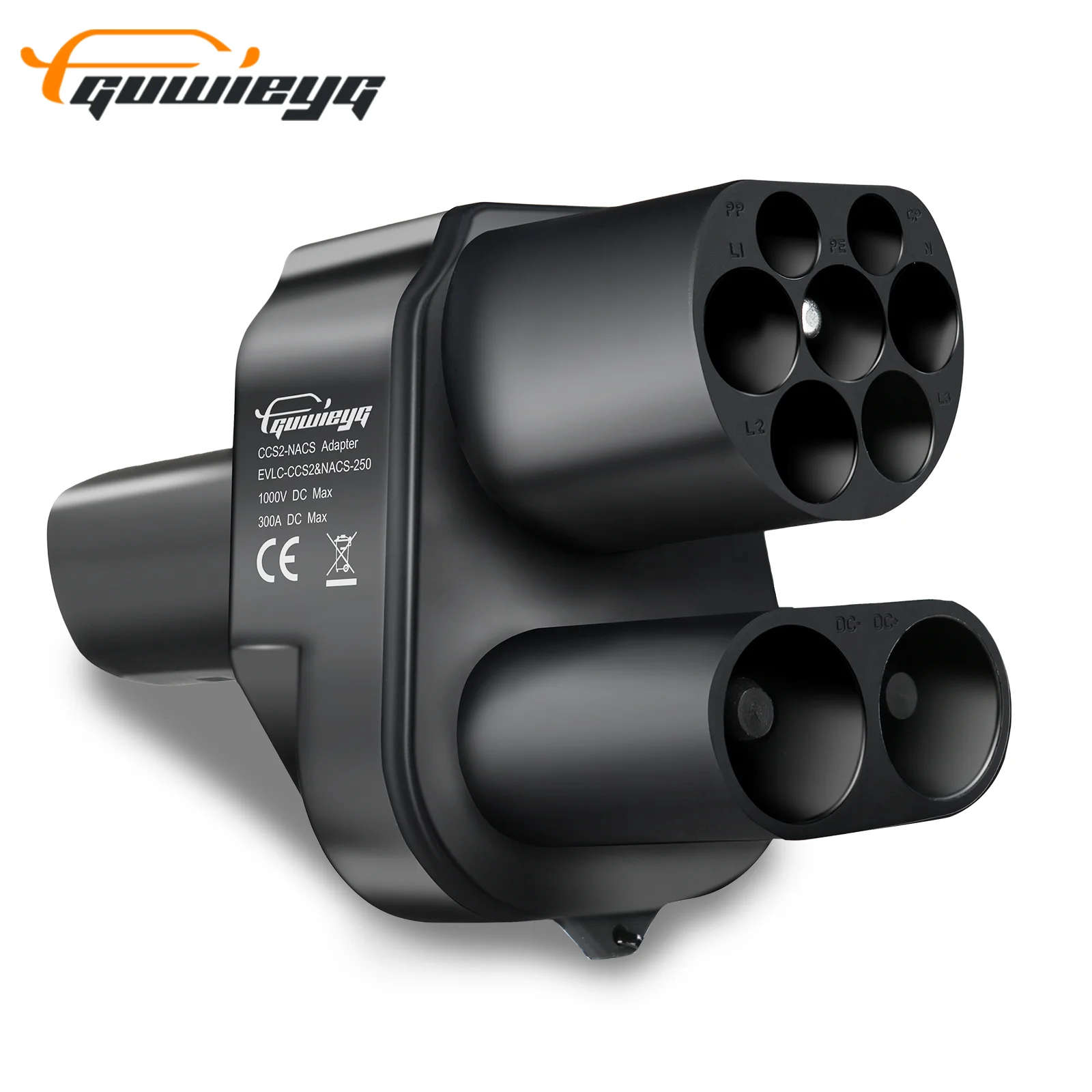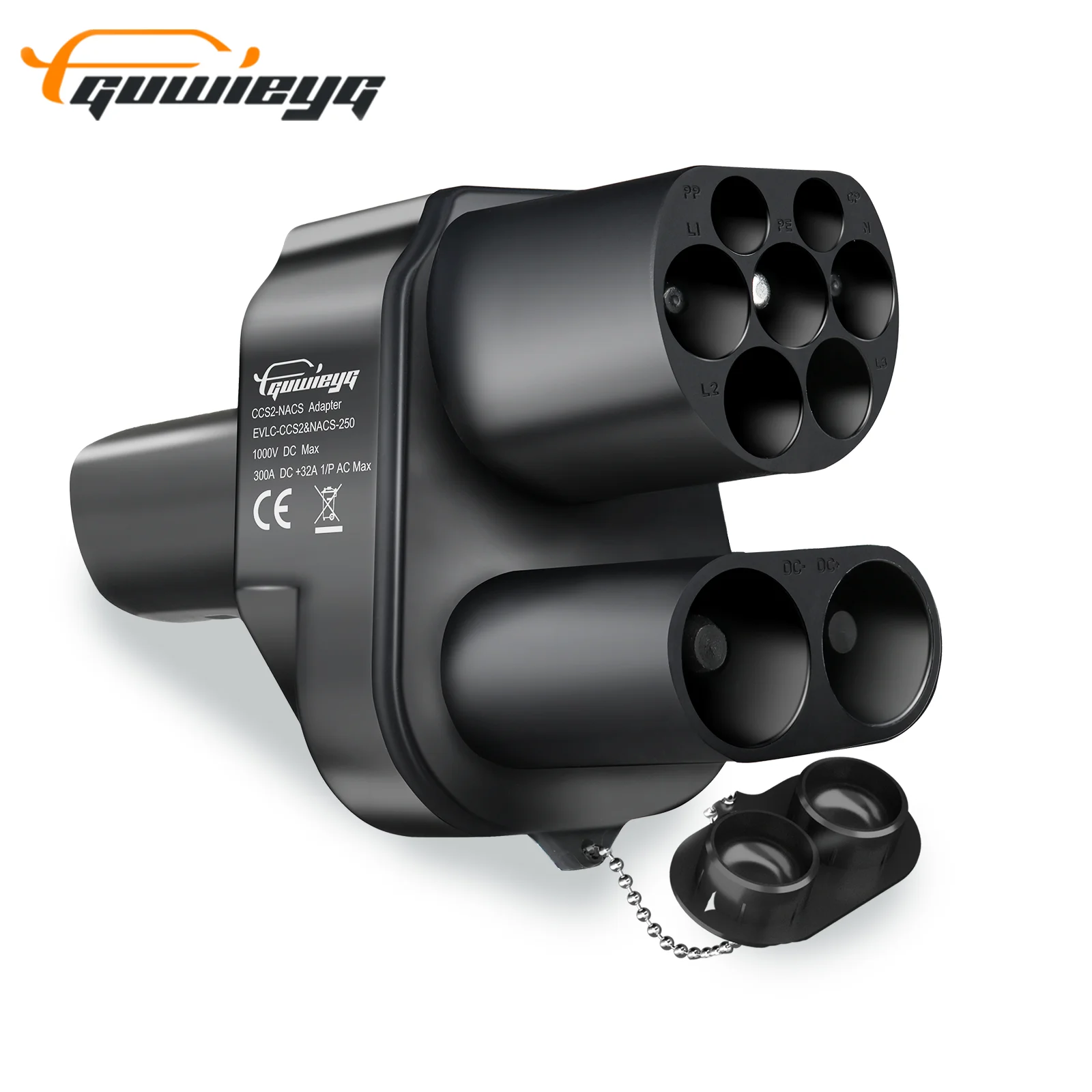 CCS2 to NACS Adapter for Tesla Model S/3/X/Y, supporting up to 300A. Made from PA66 fireproof materials, IP54 waterproof, and compatible with CCS2 and Type 2 charging stations.
