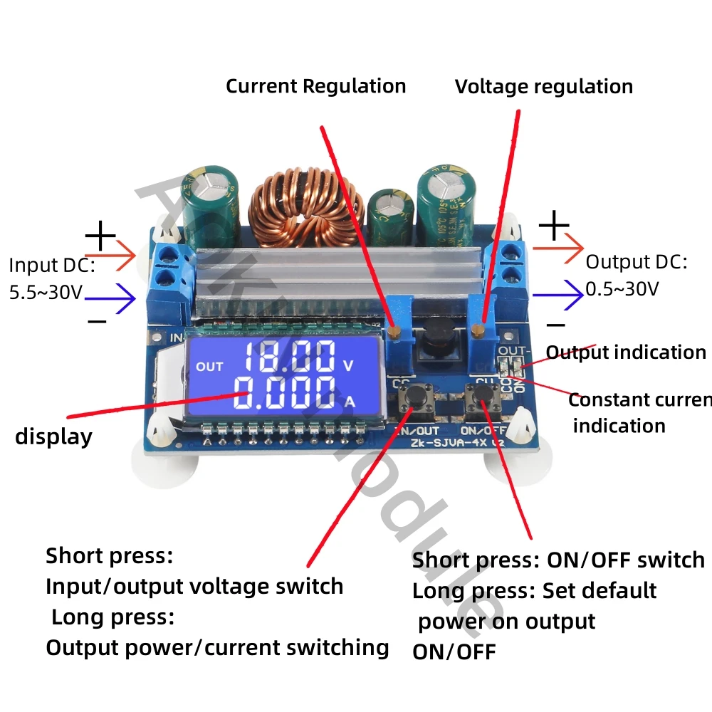 DC-DC 35W Buck Boost Converter with 5.5–30V input, .5–30V adjustable output, up to 3A stable current, advanced protections, and precise voltage/current display. Ideal for electronics and battery charging.