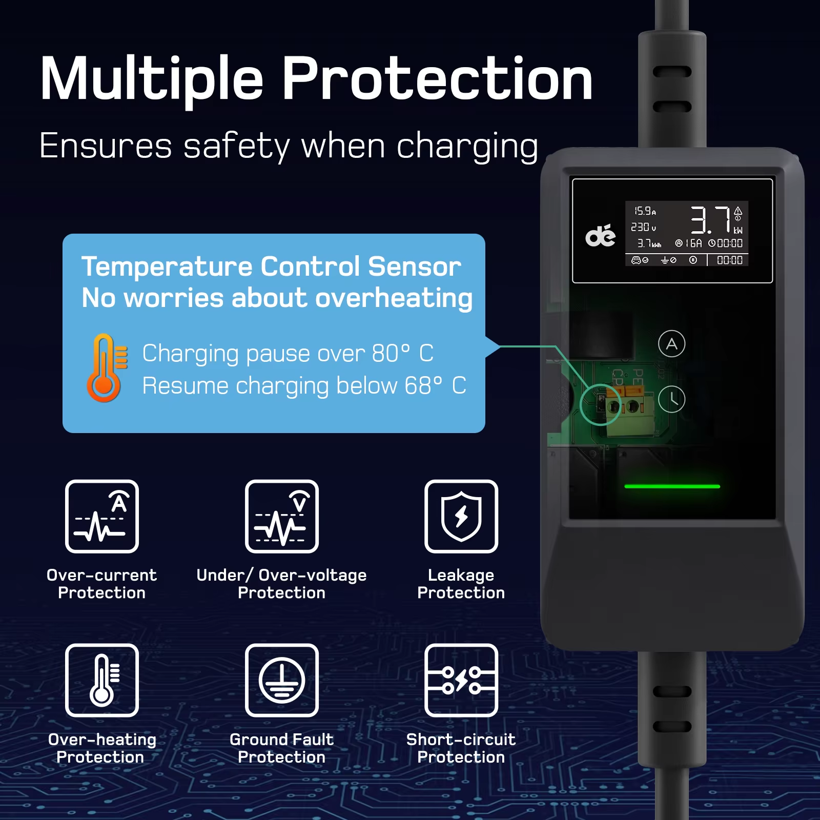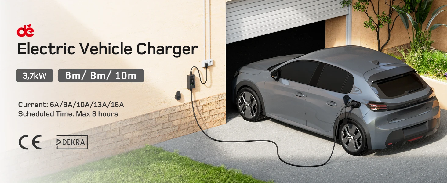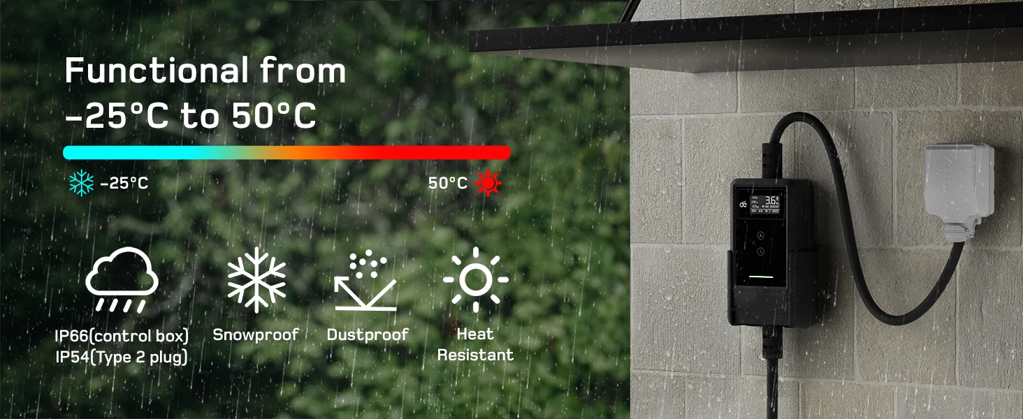 Safety is paramount with the EV Charger 3.7kW, which is built from durable TPU material and equipped with over-current, over-voltage, grounding, overheating, and short-circuit protection. Certified by CE and DEKRA, this charger ensures maximum reliability and peace of mind. The IP66-rated control box and IP54-rated Type 2 connector guarantee robust performance in any weather, from -25°C to +50°C.