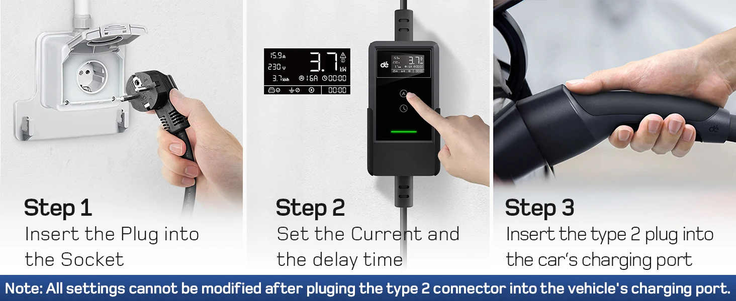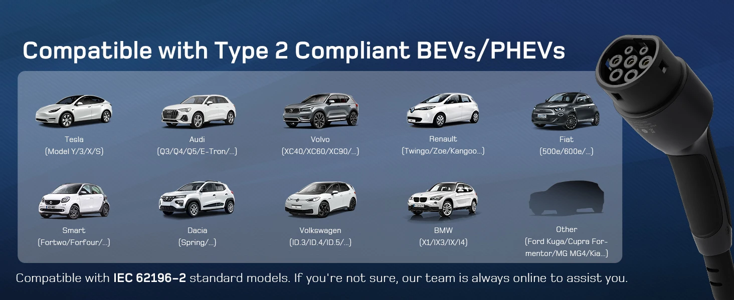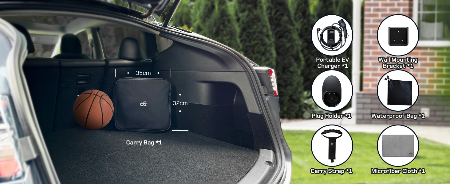 Universal compatibility makes this charger suitable for most Type 2 electric vehicles, including Model Y/3, E-208, E-Tech, 500e, XC40/C40, EV6/Niro, Ioniq 5/Kona, EQA, and other BEV/PHEV models. The lightweight, compact design and included carry bag make it your perfect on-the-go charging companion.