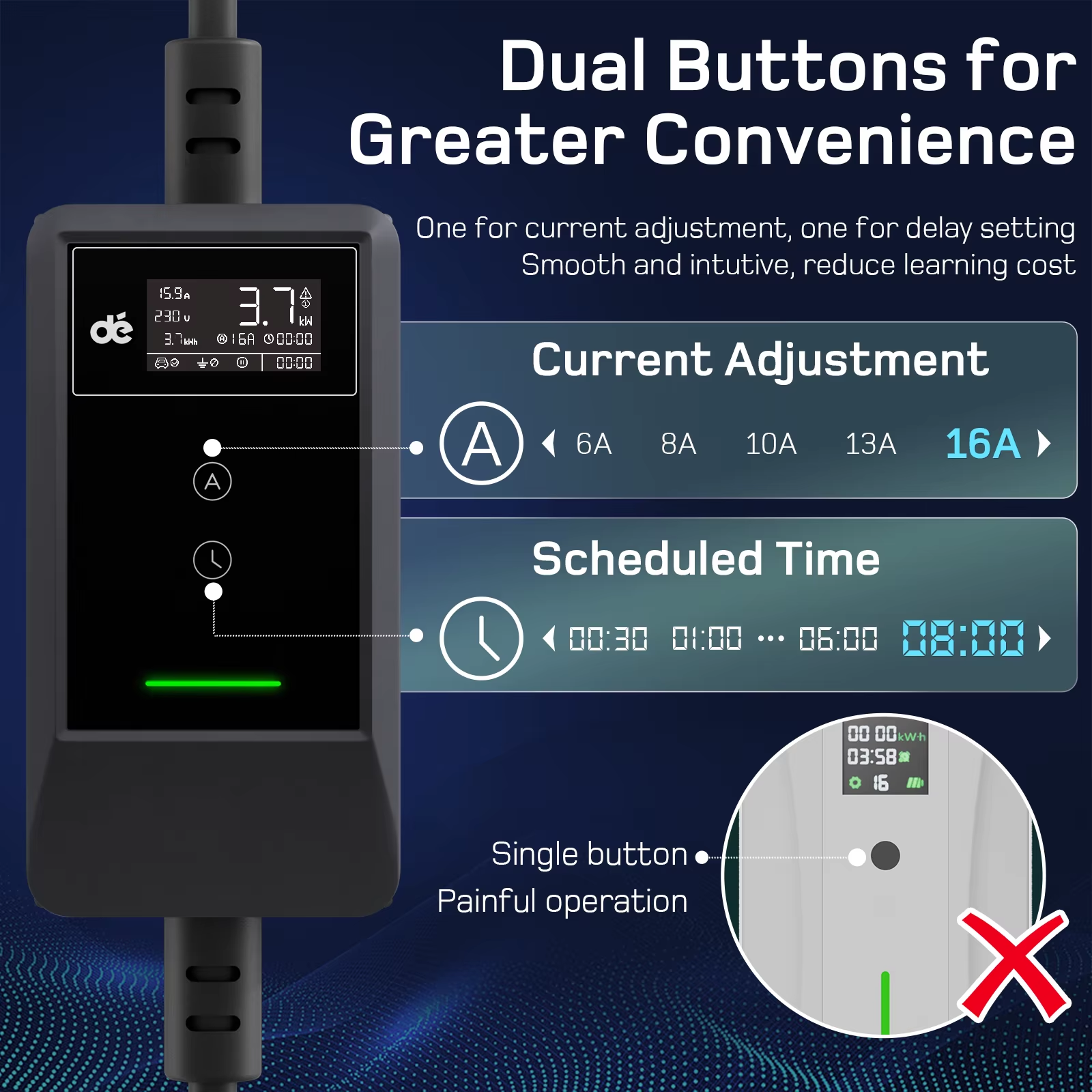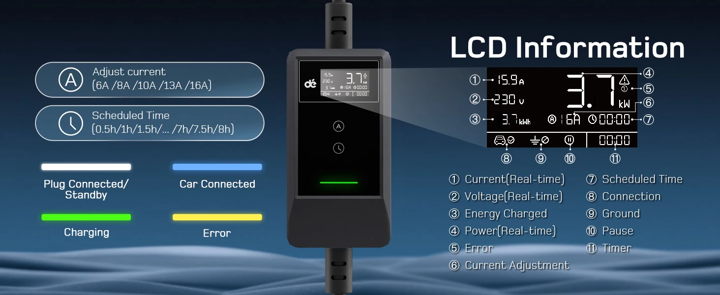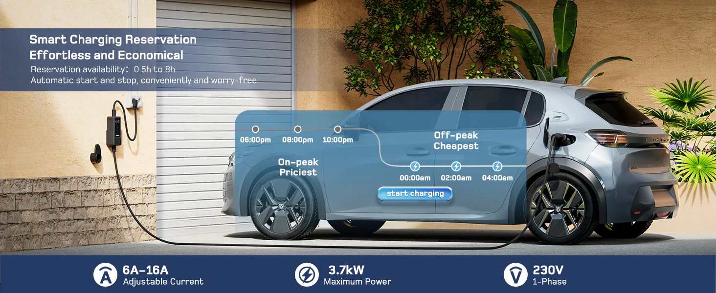 Designed for convenience, the EV Charger 3.7kW features a Schuko plug for instant charging anywhere you have access to a standard socket. The LCD screen provides real-time monitoring of charging status, while a dedicated button lets you schedule charging sessions during off-peak hours (.5 to 8 hours), making charging both effortless and economical.