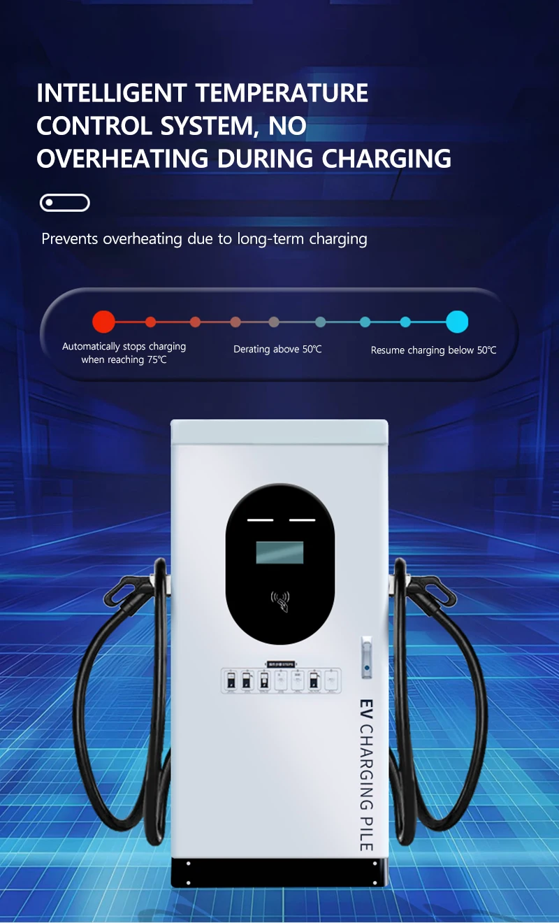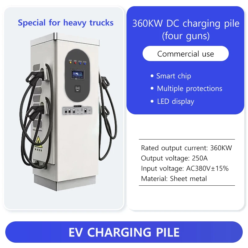 This EV charging station is available in configurations with double or four output guns, allowing simultaneous charging of multiple vehicles. The single gun output current reaches up to 250A, ensuring rapid charging cycles. The input voltage is AC380V±15%, and the output voltage ranges from DC200V to 100V, with a constant power voltage range of DC300-100V. The gun line length is customizable, with a standard 5-meter cable for convenient vehicle access.