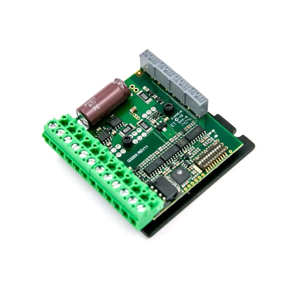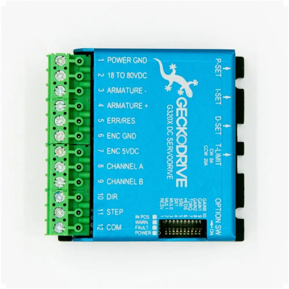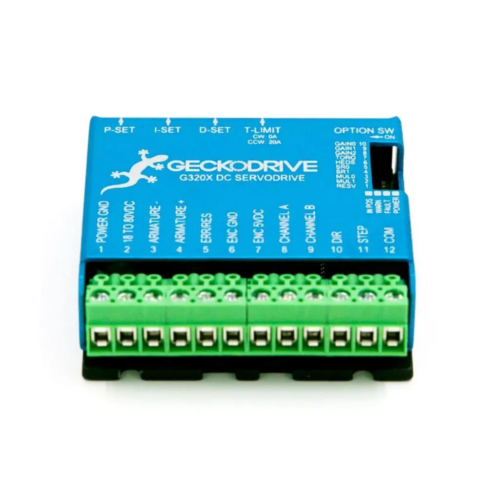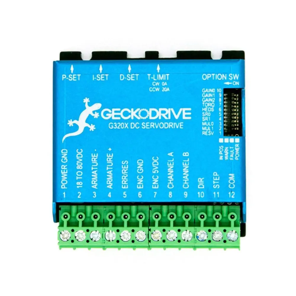 The Geckodrive G320X Digital Stepper Motor Driver is a popular, low-cost DC brush type servo driver. The G320X has a power range of 18 – 80VDC and 0 – 20A meaning it can drive larger servo motors with ease.
