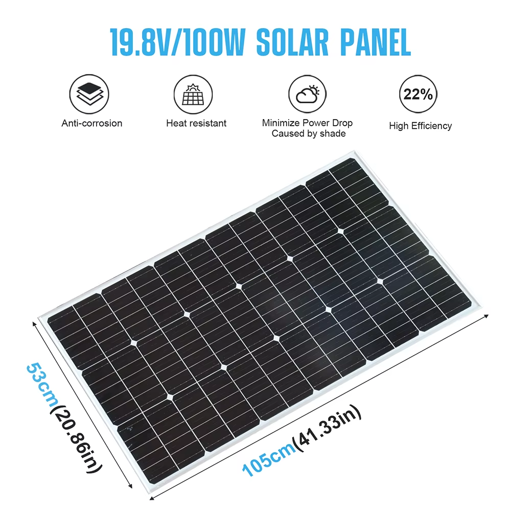 The 100W/200W Rigid Glass Solar Panel Set, 18V, features high-efficiency monocrystalline cells, toughened glass, and a corrosion-resistant frame. Durable, versatile, and ideal for home, RV, and off-grid solar systems.