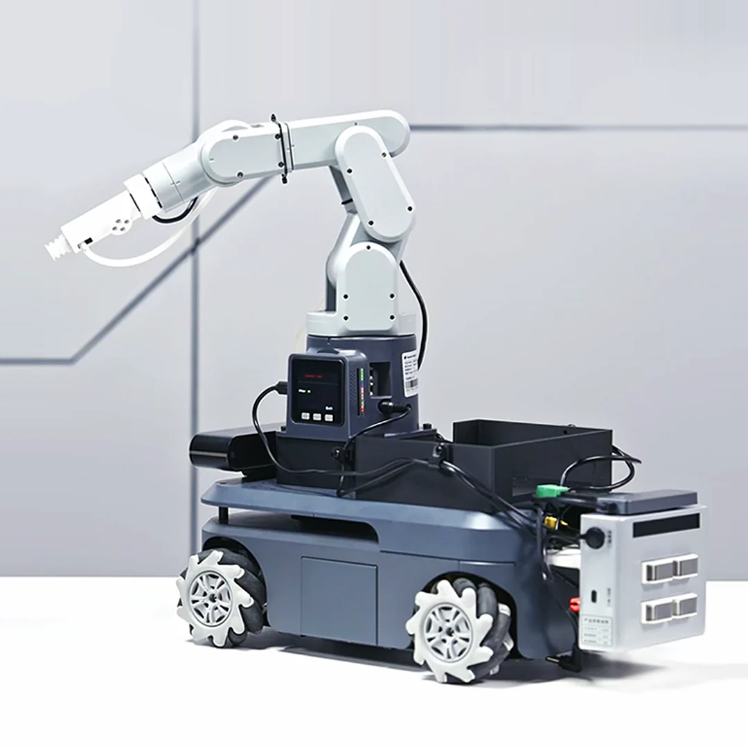 MyAGV Compound Robot Intelligent Logistics Kit—modular, ROS-based training platform with mobile chassis, 6 DOF arm, vision, suction, and 3D camera. Includes curriculum, real-time monitoring, and rapid setup for hands-on logistics automation training.