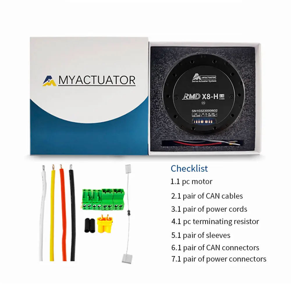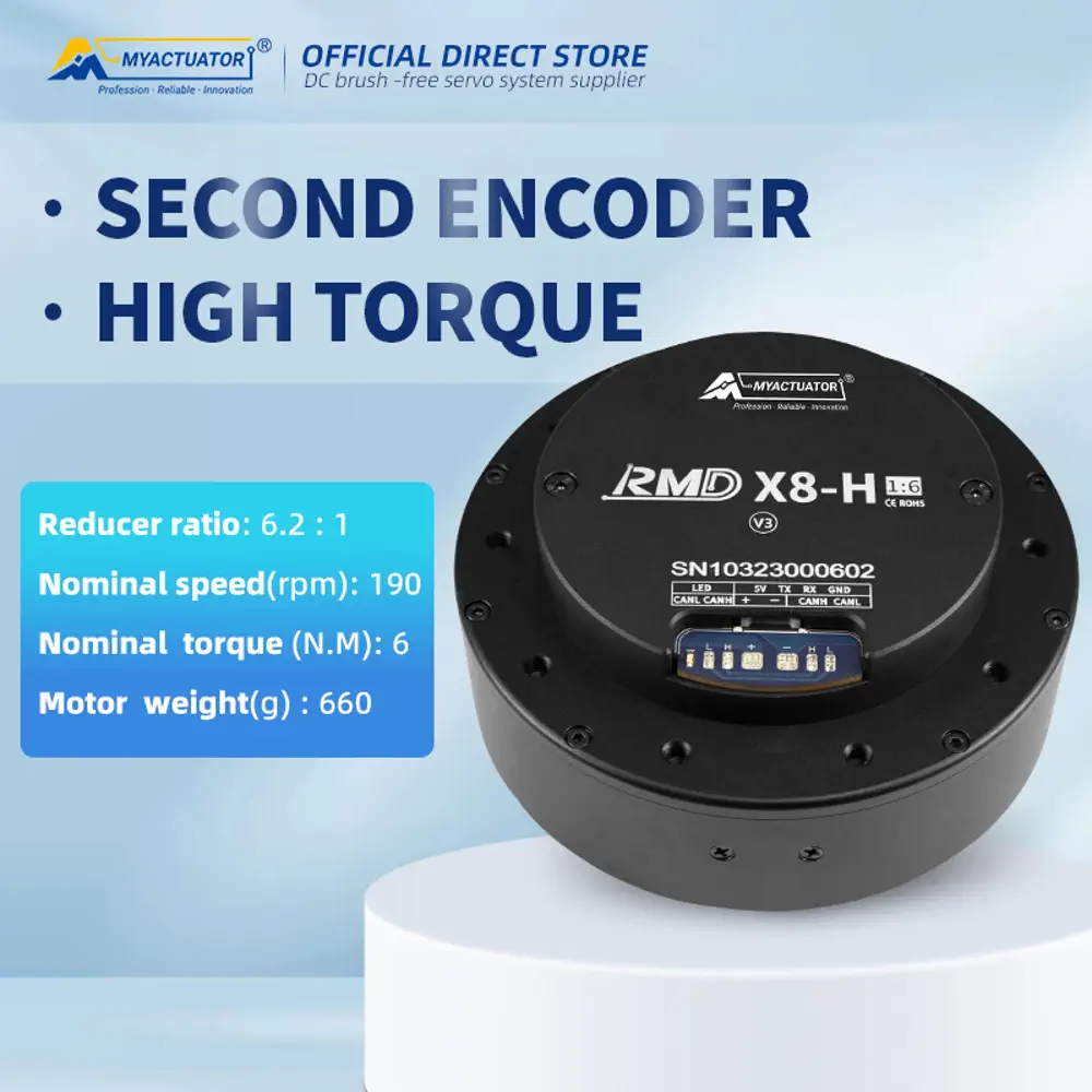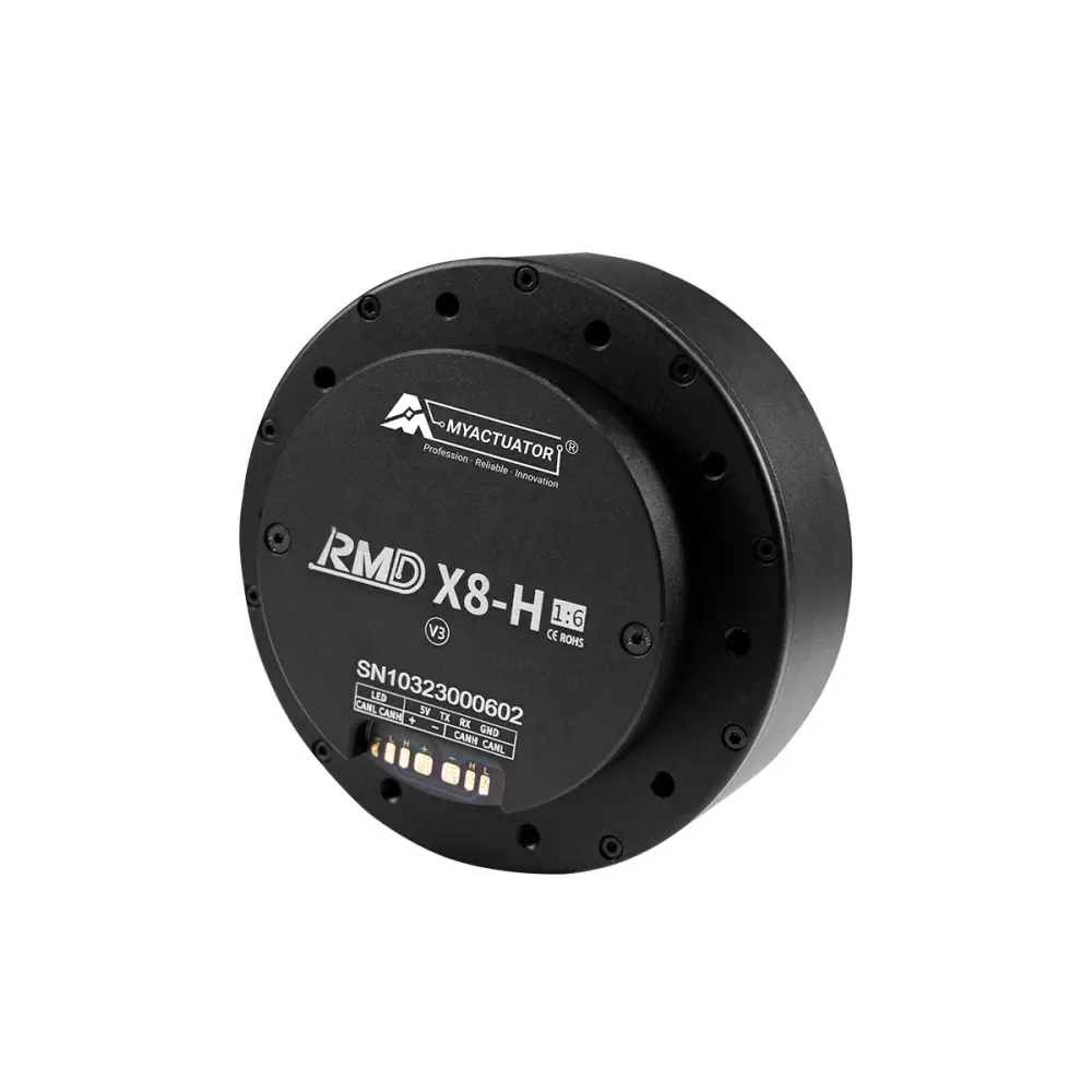 The MYACTUATOR RMD X8 V3, CAN Bus, Reduction Ratio 1:6, Helical Gear, w/ New Driver MC X 500 O Brushless Servo is a new generation of high performance brushless servo driver that can be used for driving a variety of BLDC/PMSM motors.