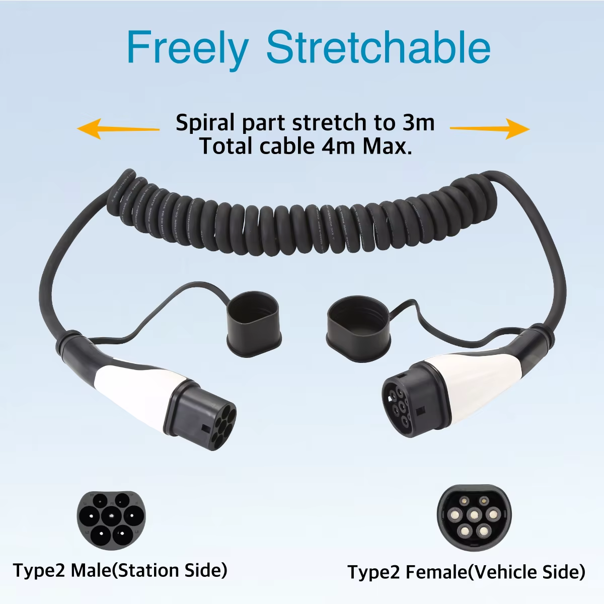 The EVcharger4U Type 2 EV Charging Spiral Cable is a premium, high-performance coiled cord designed for efficient and reliable charging of electric vehicles. Available in a 5-meter length, this spiral cable supports both single-phase and three-phase charging at 16A or 32A, delivering up to 7kW, 11kW, or 22kW of power. Engineered for flexibility and convenience, the coiled design prevents tangling and keeps your charging area organized, making it ideal for both home and public charging stations.