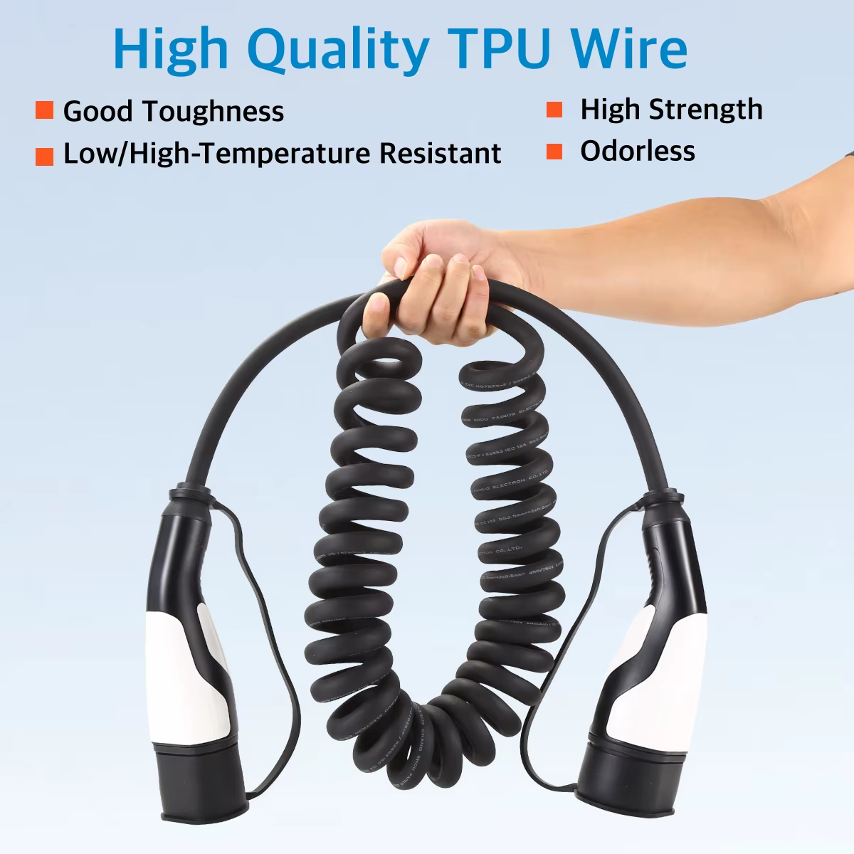 EVcharger4U Type 2 EV Charging Spiral Cable, 5m, single/three-phase, 16A/32A, 7kW/11kW/22kW, IP55, fire-retardant, abrasion and impact resistant, IEC and EN compliant.
