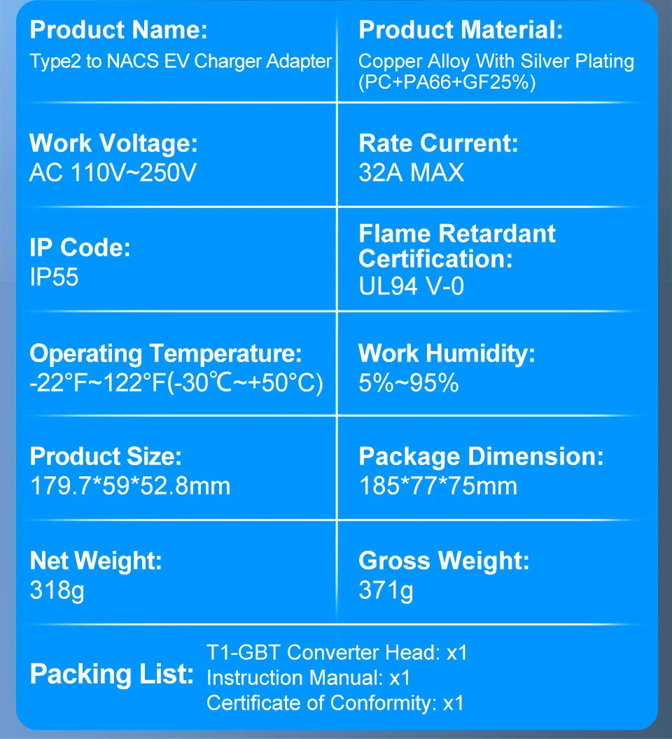 Compact and lightweight, the Type 2 to NACS EV Charger Adapter measures just 179.7 × 59 × 52.8 mm and weighs only 318g, making it easy to carry and store. Each package includes the T1-GBT converter head, an instruction manual, and a certificate of conformity for peace of mind.