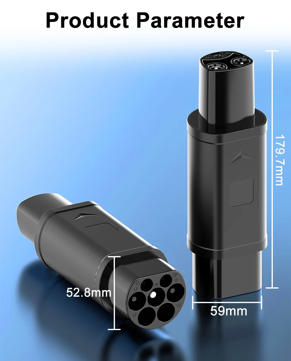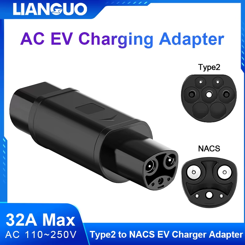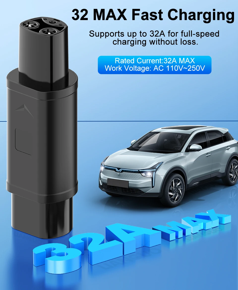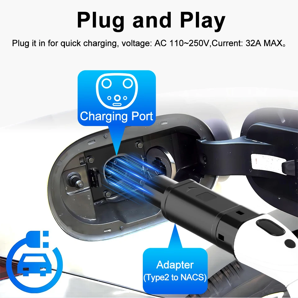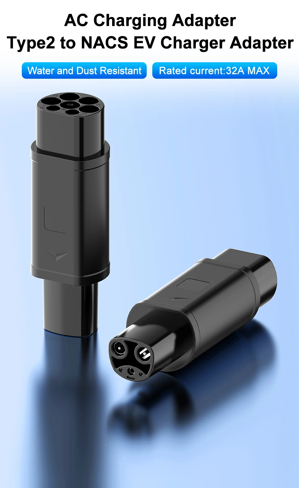 Type 2 to NACS EV Charger Adapter—up to 11kW, 32A, IP55, UL94 V- certified. Compact, safe, and reliable charging for NACS vehicles from Type 2 stations.