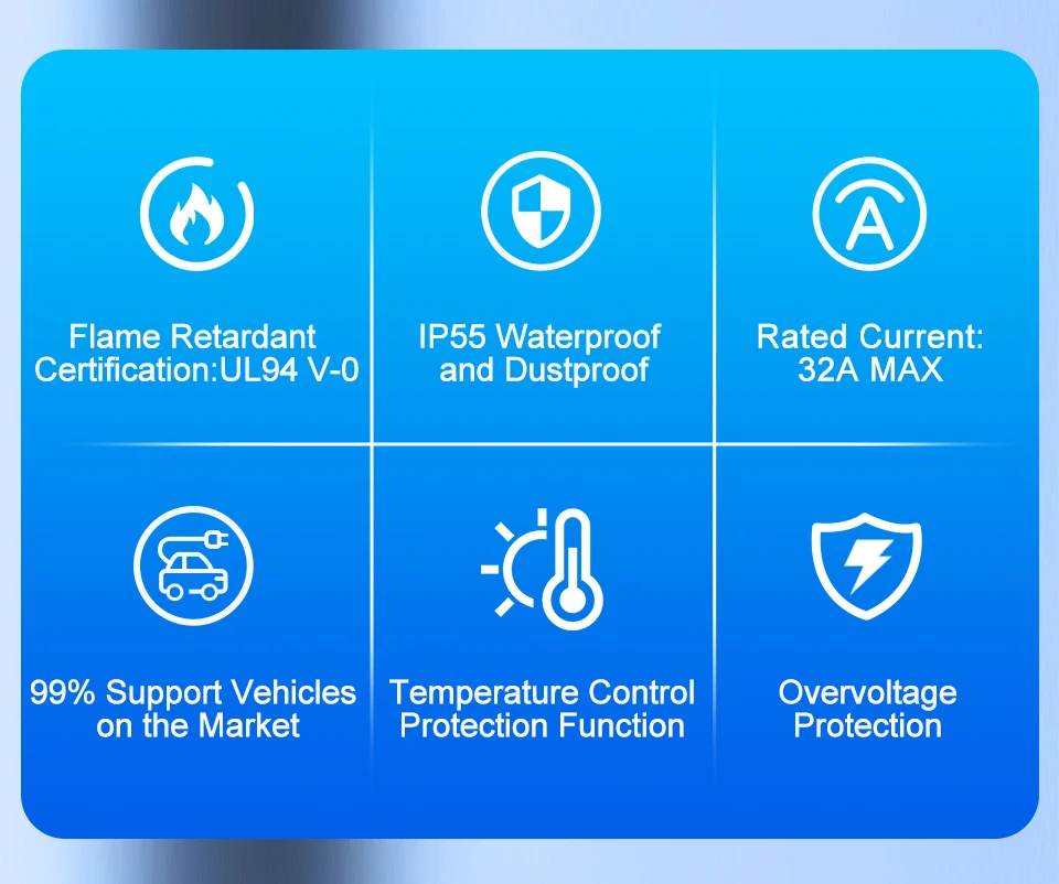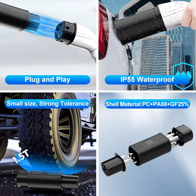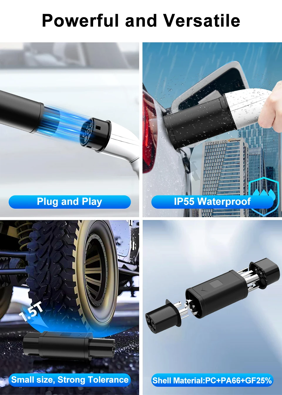 Built from copper alloy with silver plating and a durable PC+PA66+GF25% housing, the Type 2 to NACS EV Charger Adapter is engineered for long-term reliability. It features an IP55 protection rating, ensuring resistance to dust and water, and is certified to UL94 V- flame retardant standards for enhanced safety. The adapter operates efficiently across a wide voltage range (AC 110V~250V) and in extreme temperatures from -30°C to +50°C, withstanding humidity levels from 5% to 95%.