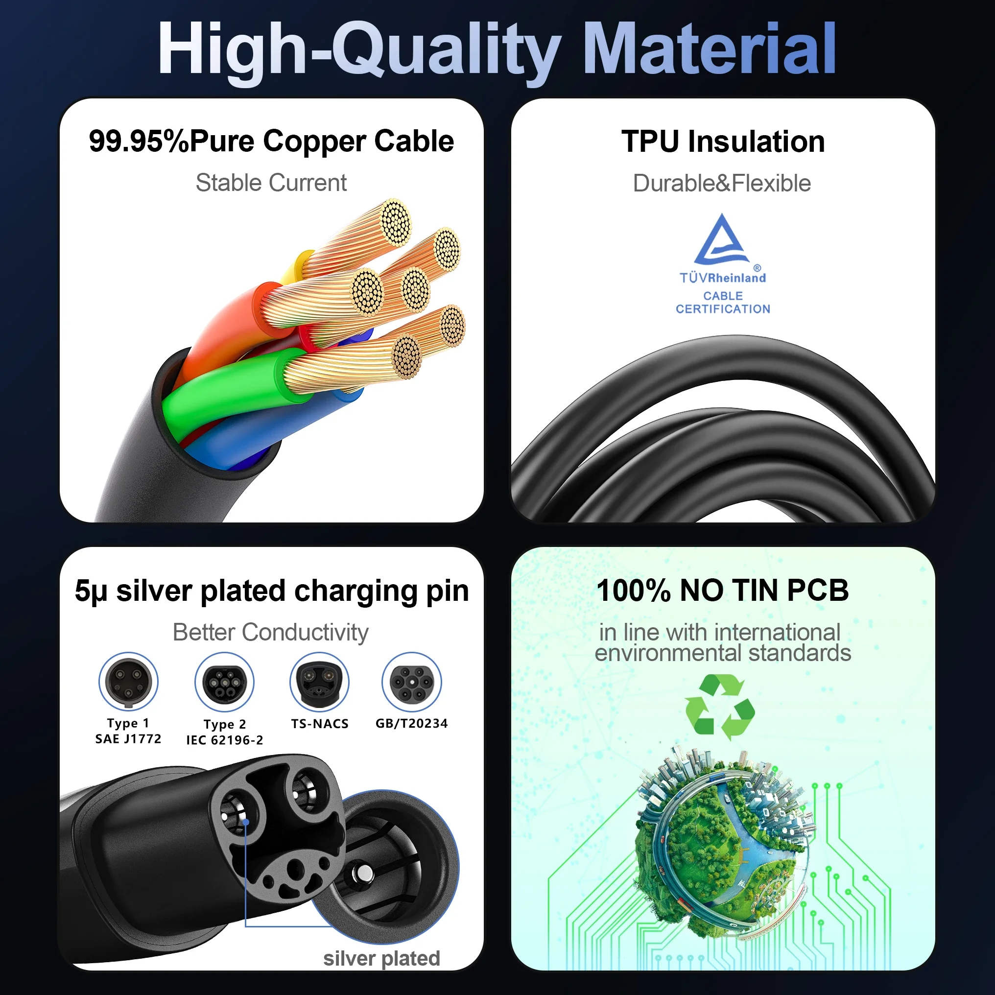 Certified by TUV for safety, the cable’s shell is made from premium TPU, delivering superior wear resistance and high temperature tolerance. The silver-plated copper alloy pins and special reed structure provide optimal conductivity and include temperature monitoring for added protection during every charging session. With an IP66 waterproof rating, this cable is built for all-weather use, making it suitable for both indoor and outdoor installations.
