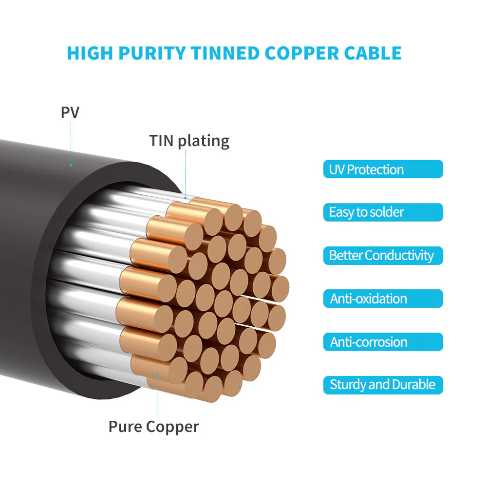 Renogy’s durable tray cables ensure a reliable connection between your batteries and charge controller, featuring specialized terminal rings for secure battery attachment and exposed wire ends for fast, hassle-free charge controller connection. The adapter kit cables come equipped with waterproof solar connectors on the module ends and exposed wire for easy integration with your charge controller terminals, ensuring a weather-resistant and robust setup.